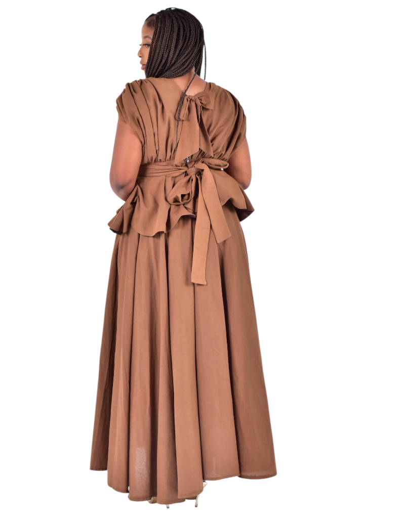 Description: Drawstrings ruched sleeves maxi dress, with front cut out design & a detachable peplum belt