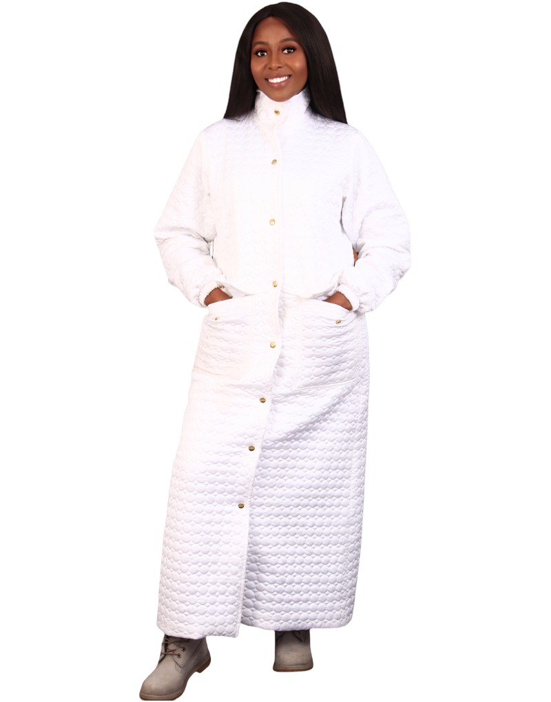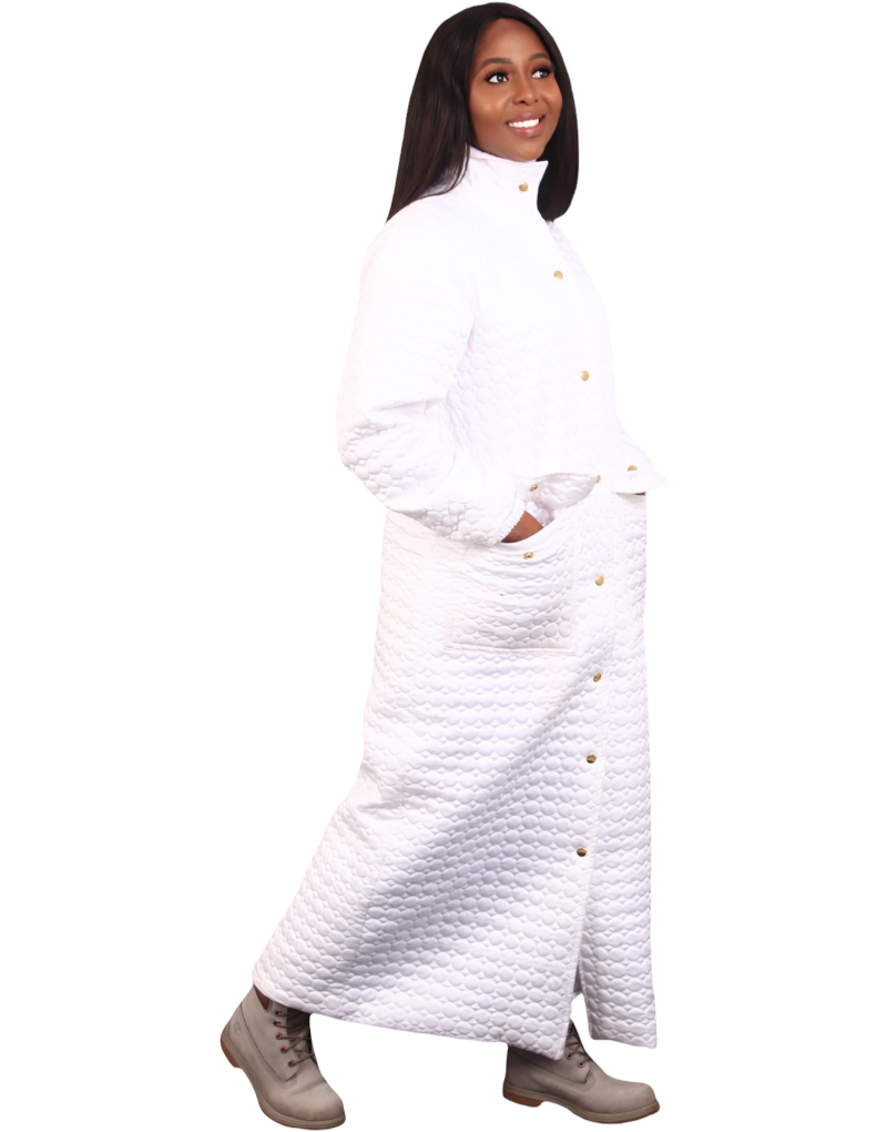 Description: Long Quilted Puffer Coat with Gold Press Buttons & Side Pockets