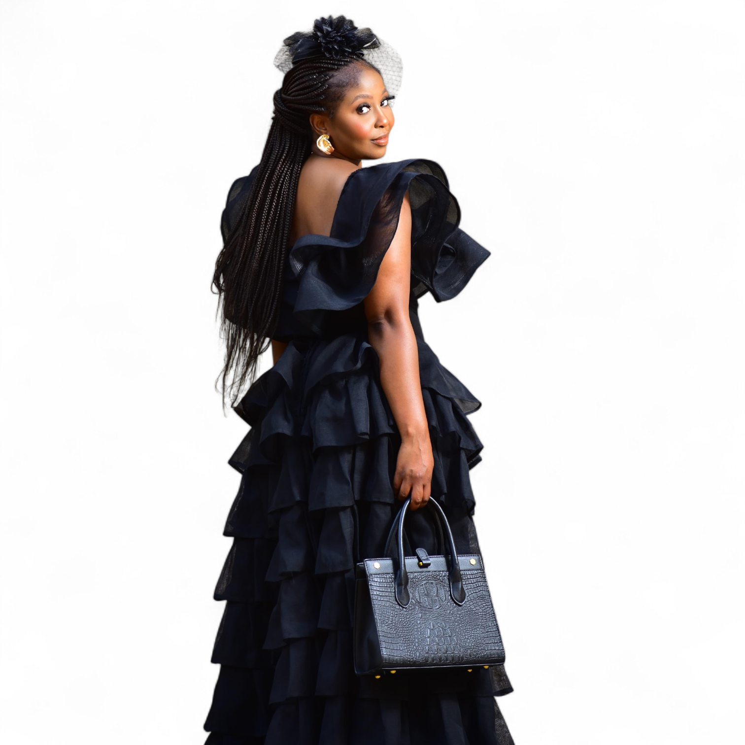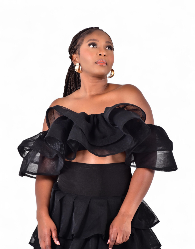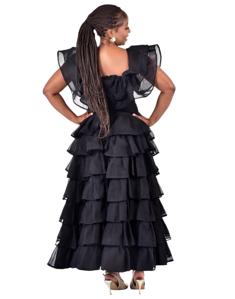 Description: The Skirt is a multi-layered tier of sheer fabric and ruffle top with ruffled sleeves