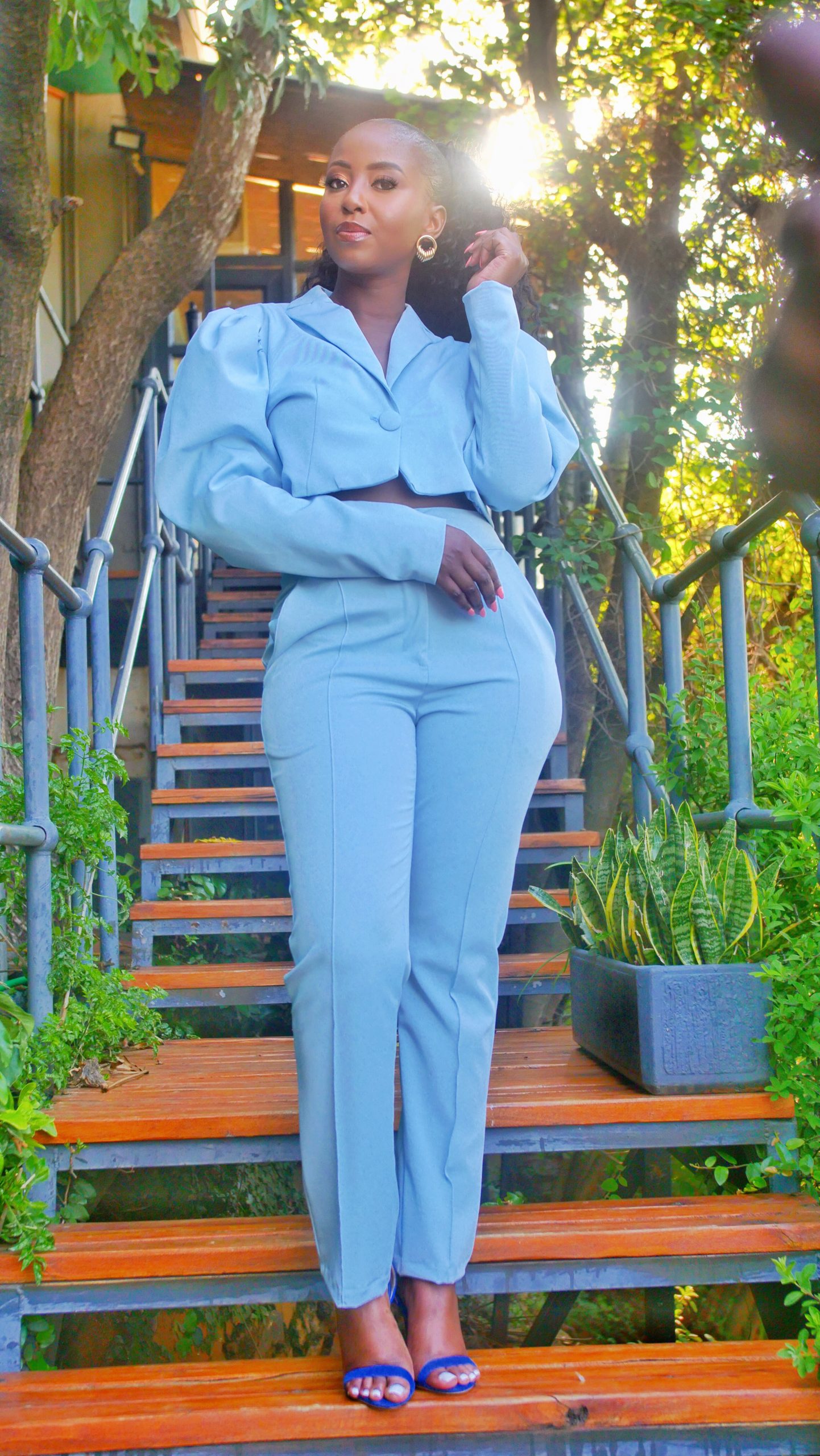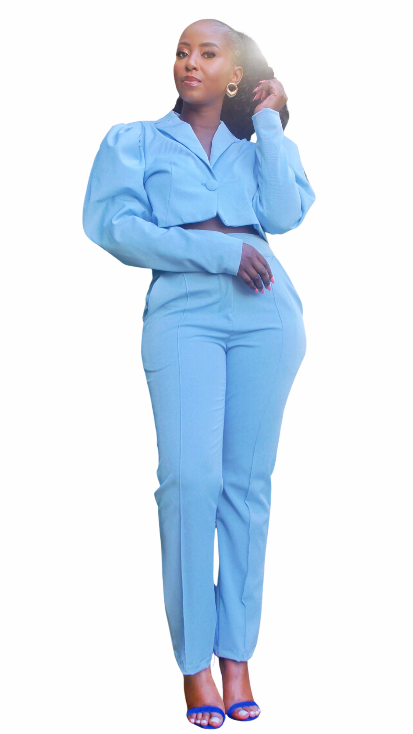 Description: Sky blue Crop Jacket with bubble sleeves and fitted high waist pants
